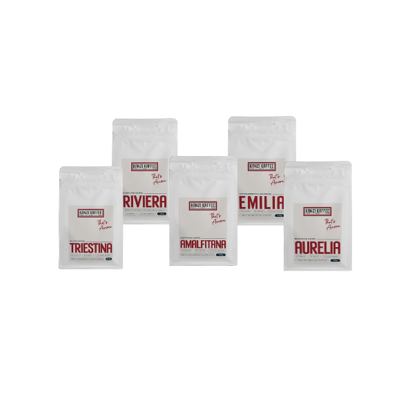 Probierangebot mit je 250g Amalfitana, Aurelia, Emilia, Riviera und Triestina Kaffee